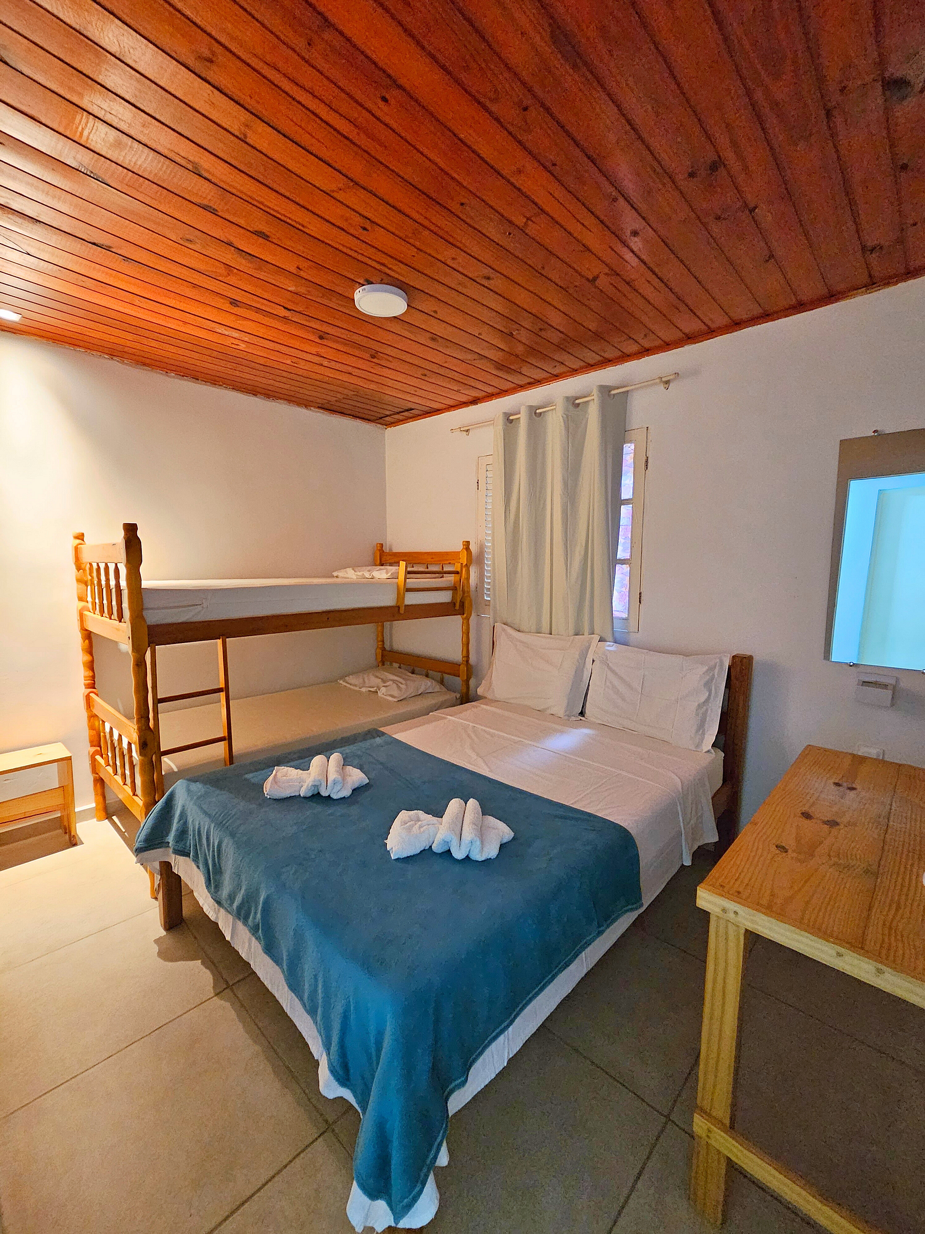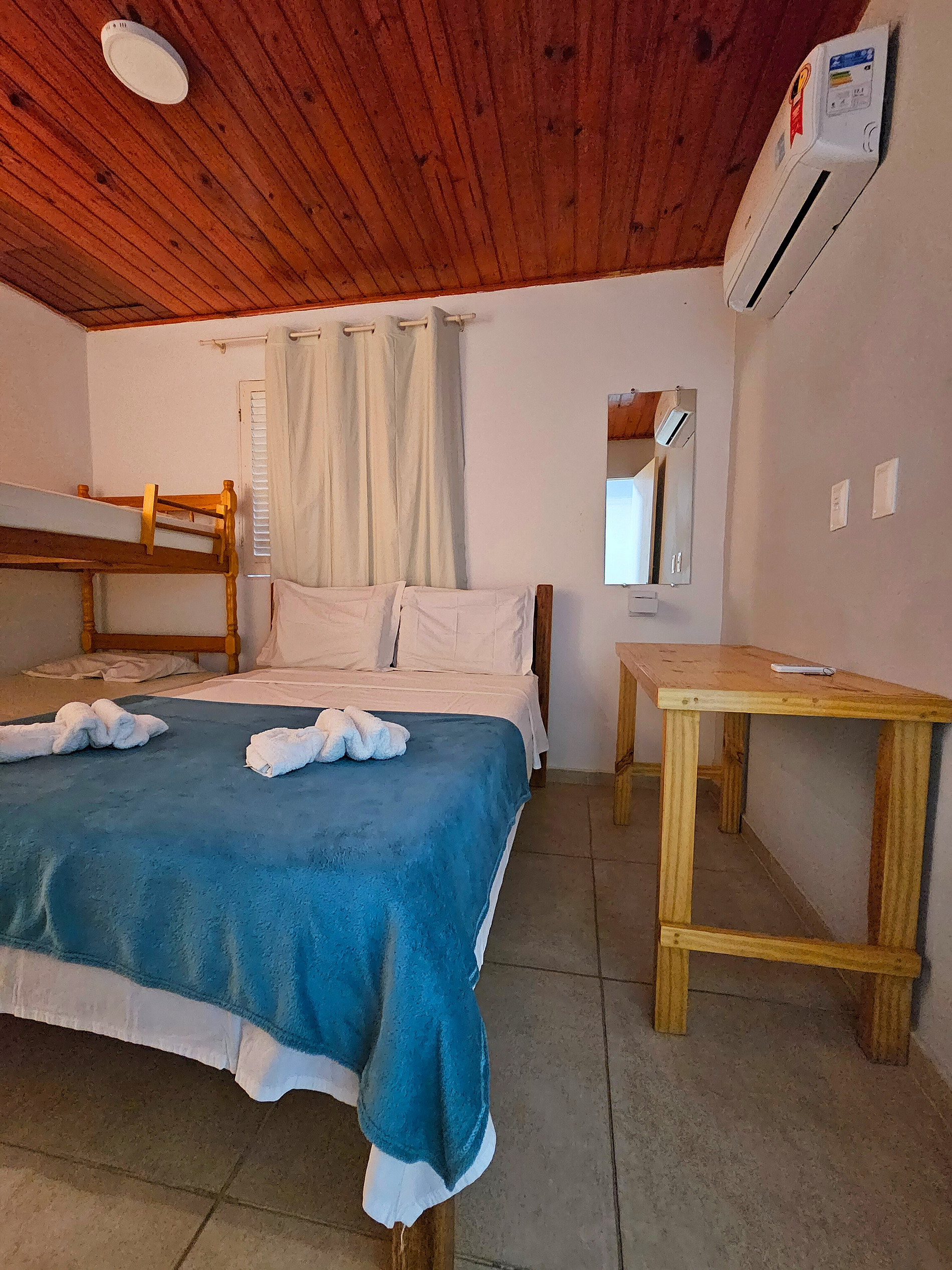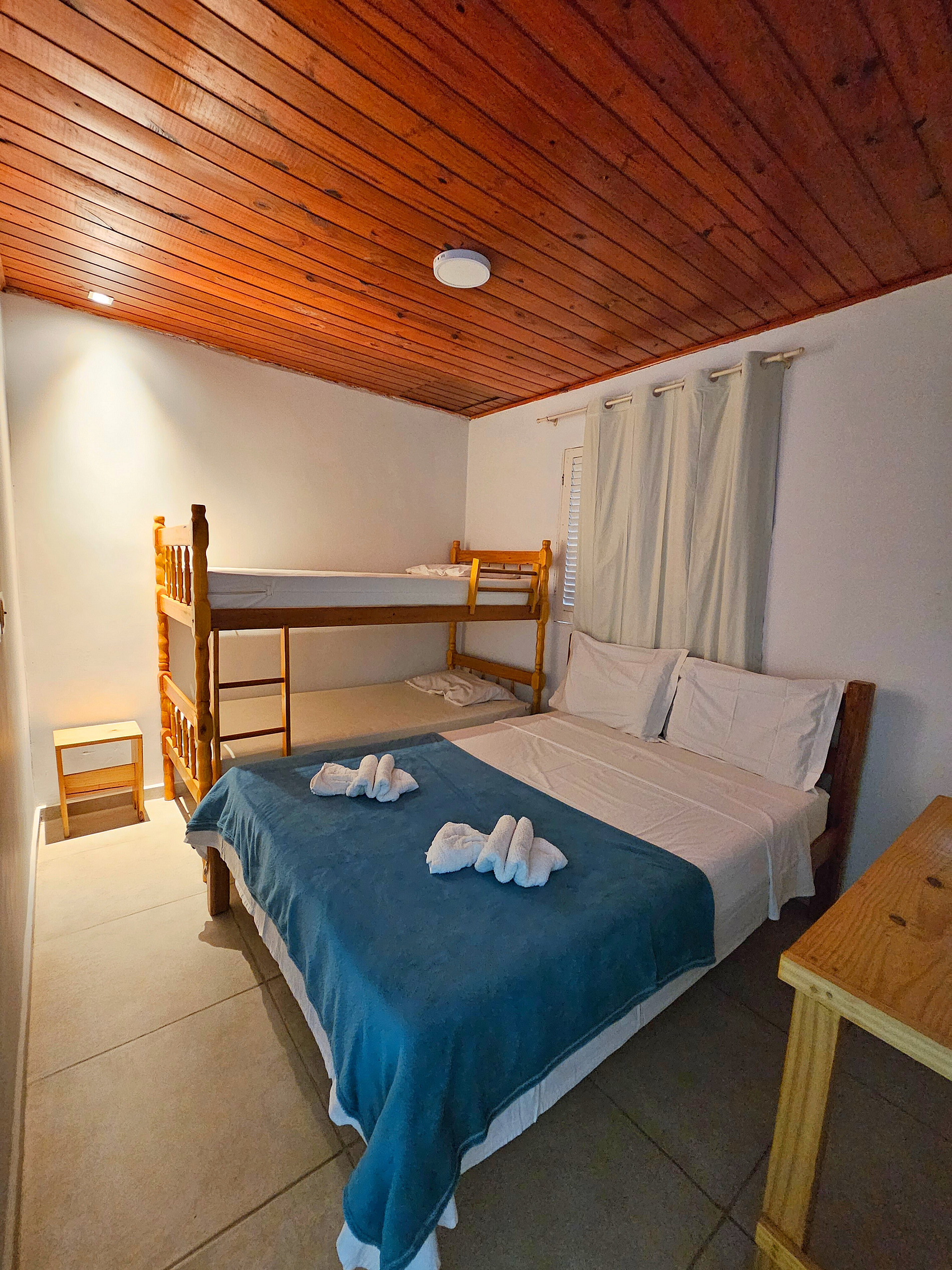 -Quarto nº 3: Acomoda até 5 hóspedes, com 1 cama de casal, 1 beliche e 1 colchonete.