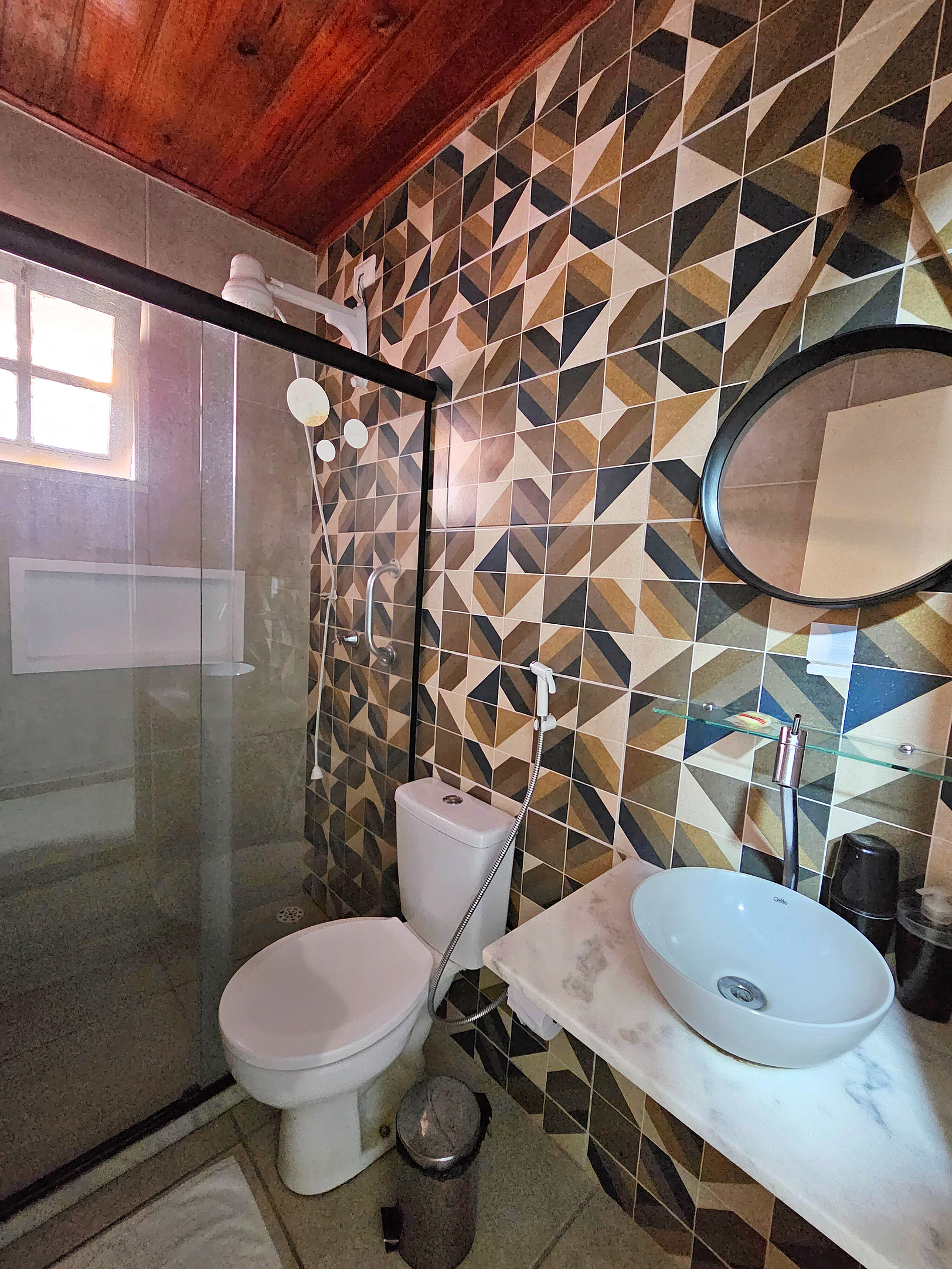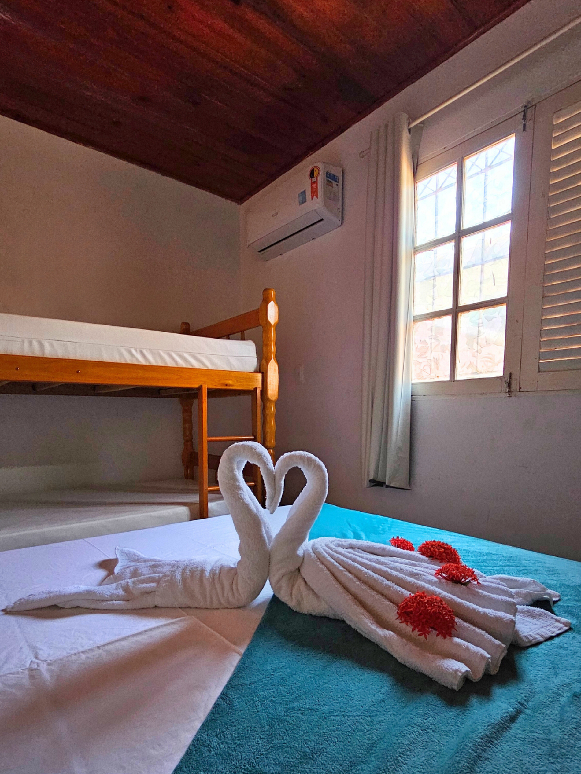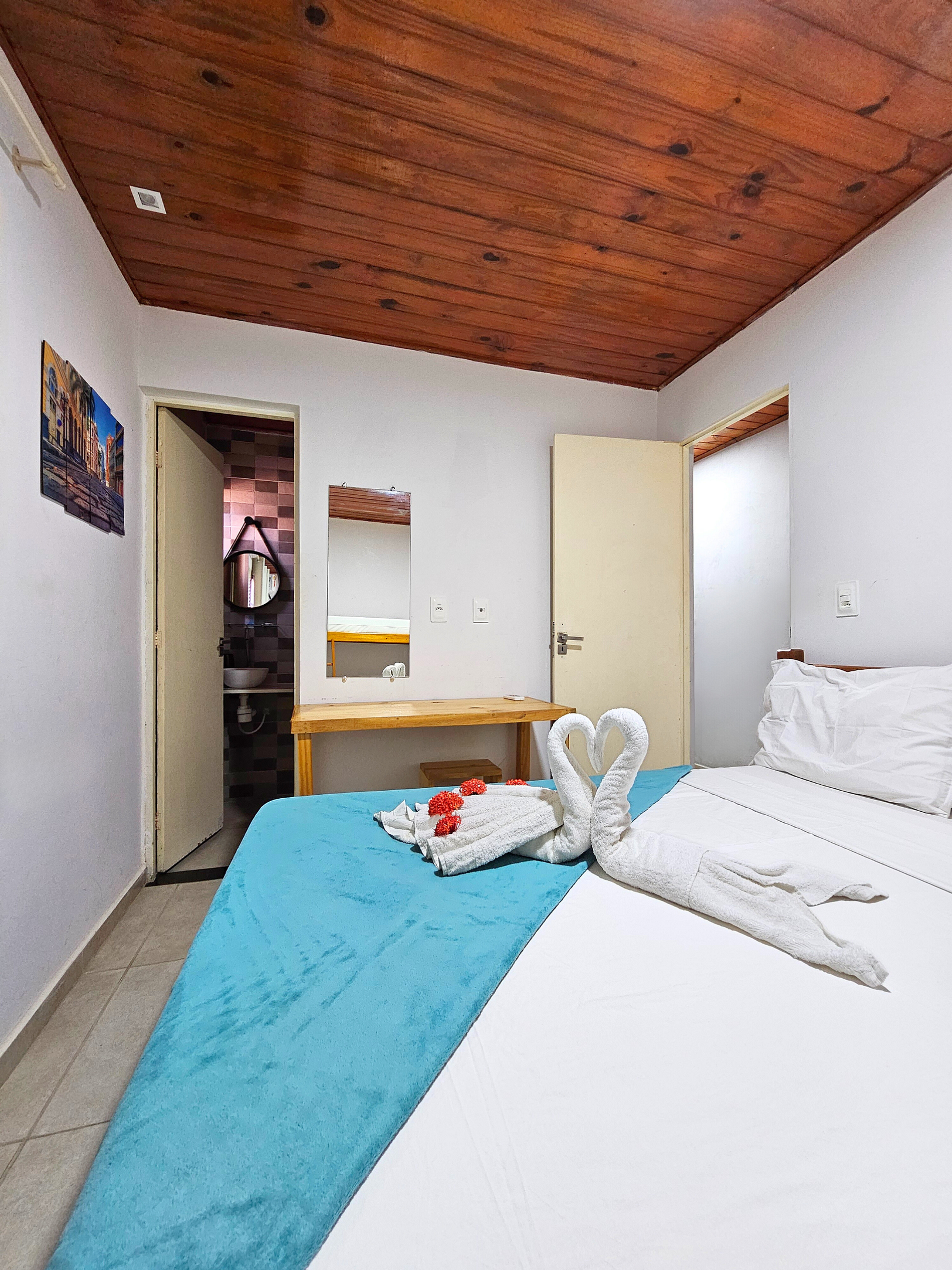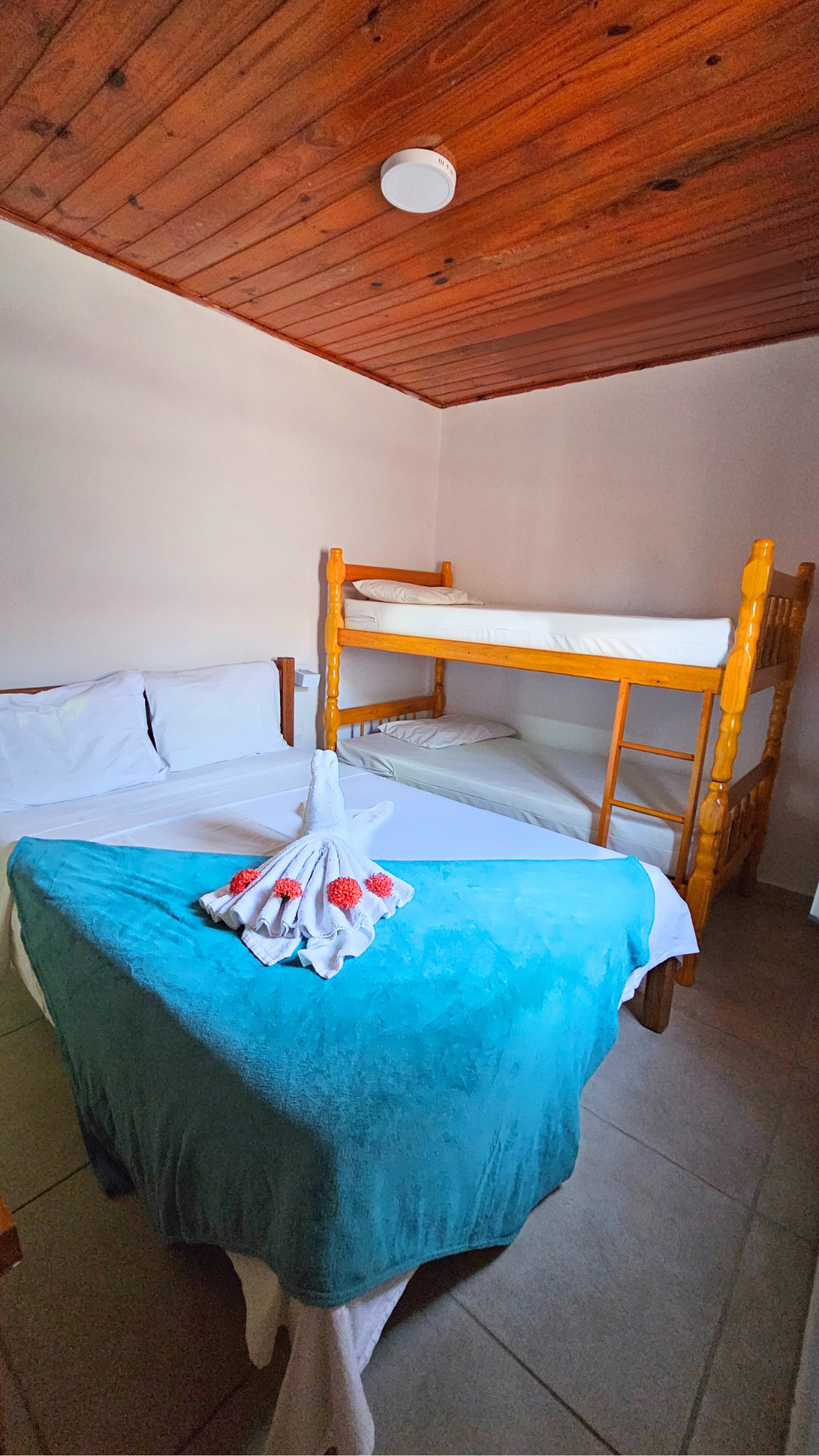 -Quarto nº 3: Acomoda até 5 hóspedes, com 1 cama de casal, 1 beliche e 1 colchonete.